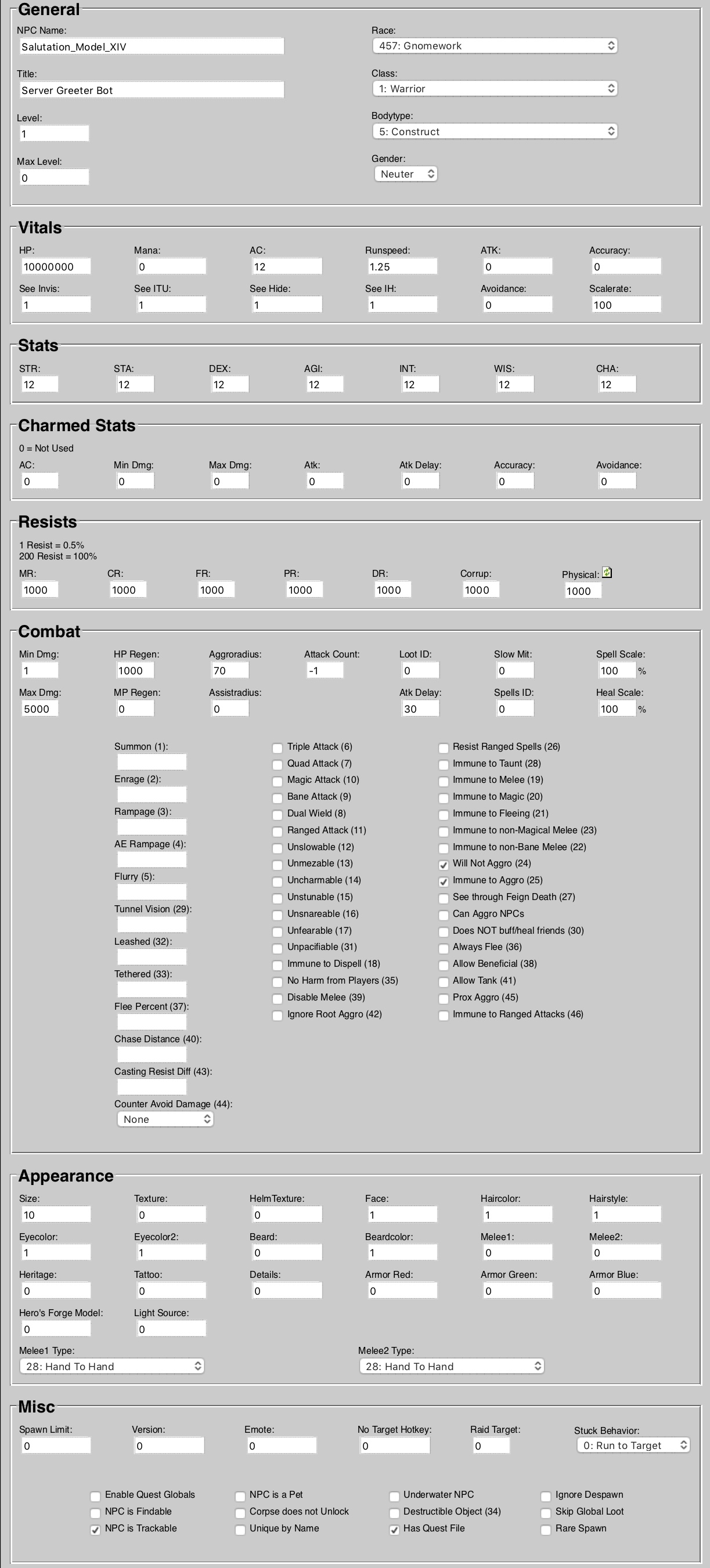 For our Server Greeter Bot, we are going to input the NPC Name as "Salutation_Model_XIV", select the 457 - Gnomework race, with a 5 - Construct bodytype setting, gender Neuter. These options will cause the NPC to display correctly to the client. Be sure to also place a checkmark in the following boxes: Will Not Aggro (24), Immune to Aggro (25), and Has Quest File. The rest of the settings are entirely up to you. You can choose to match the settings below for the purposes of this guide. We do want our Greeter Bot to be noticeable, so we have increased the size to 10. We also don't want our Greeter Bot to be accidentally killed, so we have made the NPC quite resilient by granting ridiculous HP and resist.