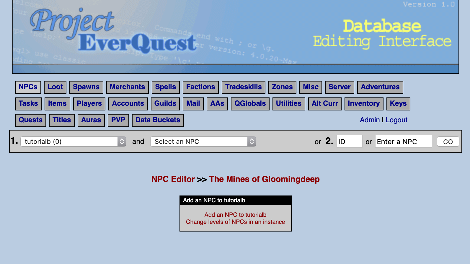 Once you have logged into your PEQ Editor, click on the NPCs tab. Here you will have the opportunity to select the desired zone, interrogate the data for existing NPCs, or explore NPC-related information, such as emotes and auras.