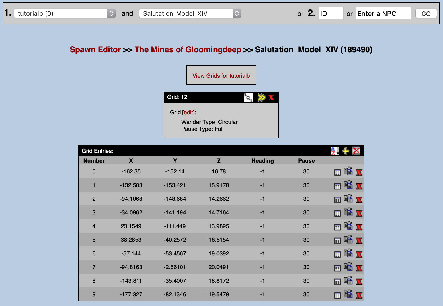 The Pathing Grid has Wander types, Pause types, and a listing of Waypoints that your NPC will follow. To review the Grid fields in your database, reference the grid page (opens new window) in the Database Schema documentation. For information regarding the Waypoint entry fields in your database, reference the grid_entries page (opens new window).