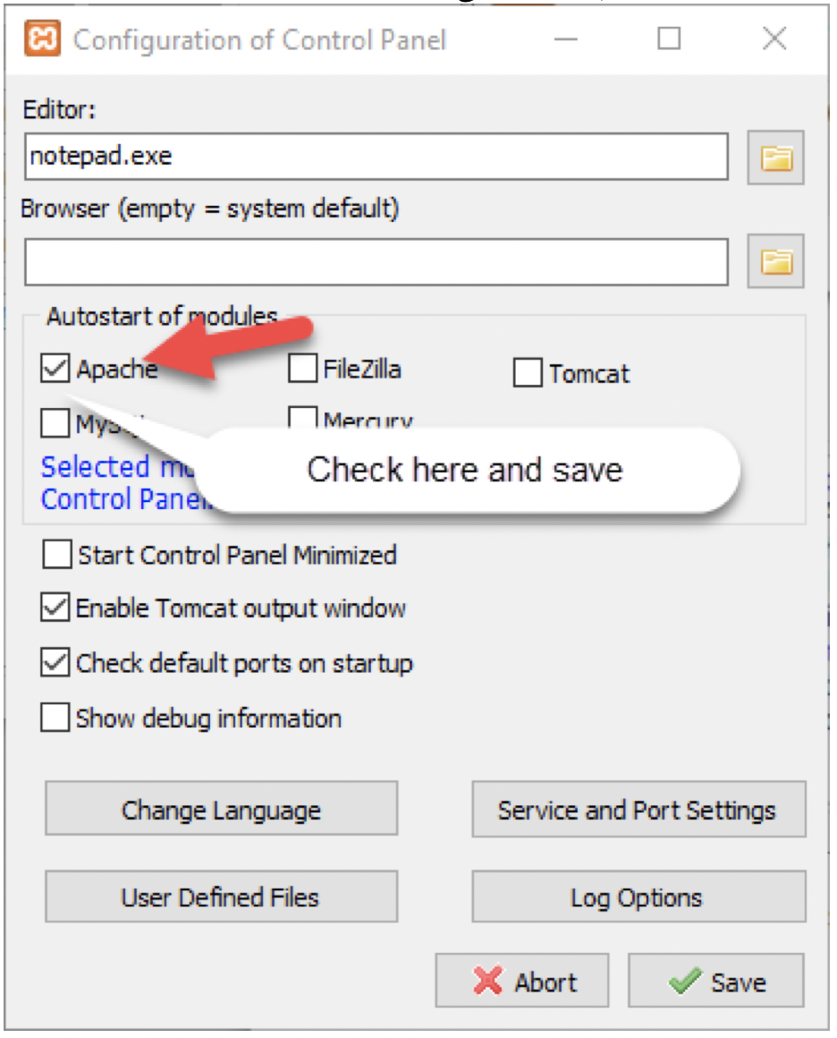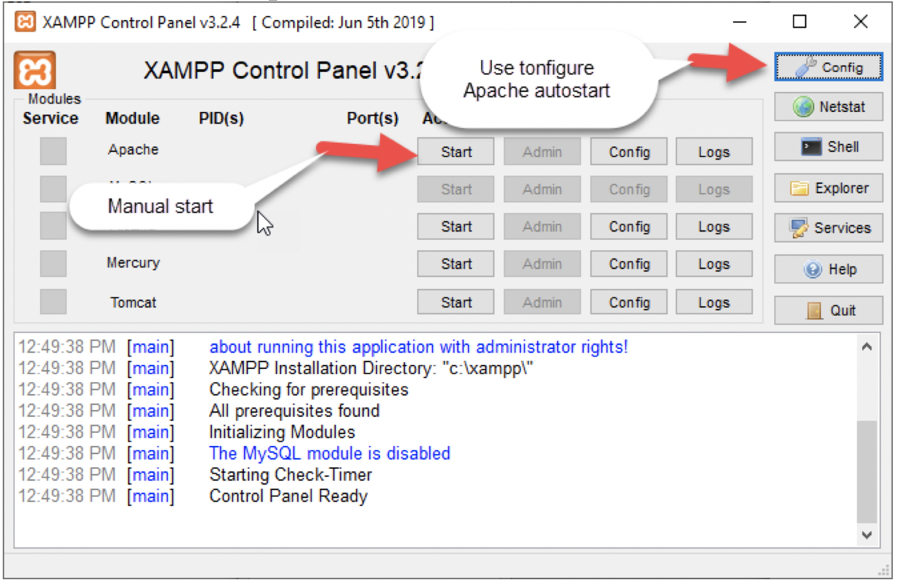 If you want to configure Apache auto-start, click on config (you will need to exit the control panel and restart as Admin to save the configuration).